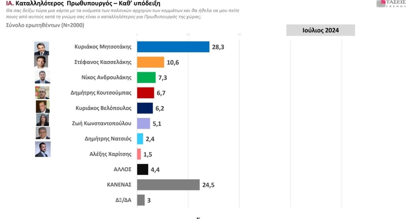Ως καταλληλότερο πρωθυπουργό, οι πολίτες θεωρούν τον Κυριάκο Μητσοτάκη με 28,3%, ακολουθεί ο Στέφανος Κασσελάκης με 10,6% και ο Νίκος Ανδρουλάκης με 7,3%, ενώ πολύ κοντά στον πρόεδρο του ΠΑΣΟΚ είναι ο Δημήτρης Κουτσούμπας με 6,7%.