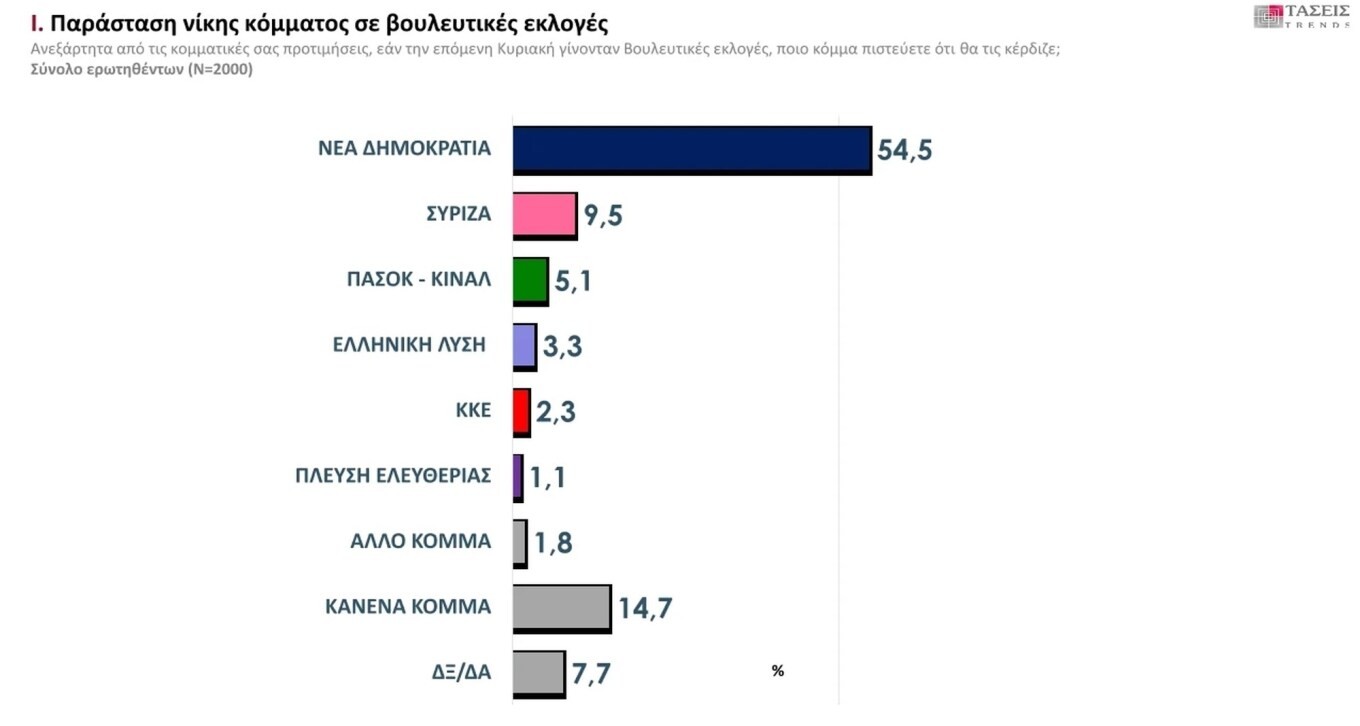 Στην παράσταση νίκης, προηγείται με 54,5 % η ΝΔ, ενώ ο ΣΥΡΙΖΑ συγκεντρώνει ποσοστό 9,5 %. το ΠΑΣΟΚ 5,1 %, η Ελληνική Λύση 3,3 %, το ΚΚΕ 2,3 %, η Πλεύση Ελευθερίας 1,1 %. Η επιλογή «Κανένα κόμμα» καταγράφει ποσοστό 14,7 %. Η επιλογή «Άλλο κόμμα» 1,8 % και «Δεν ξέρω/Δεν απαντώ» ποσοστό 7,7 %.