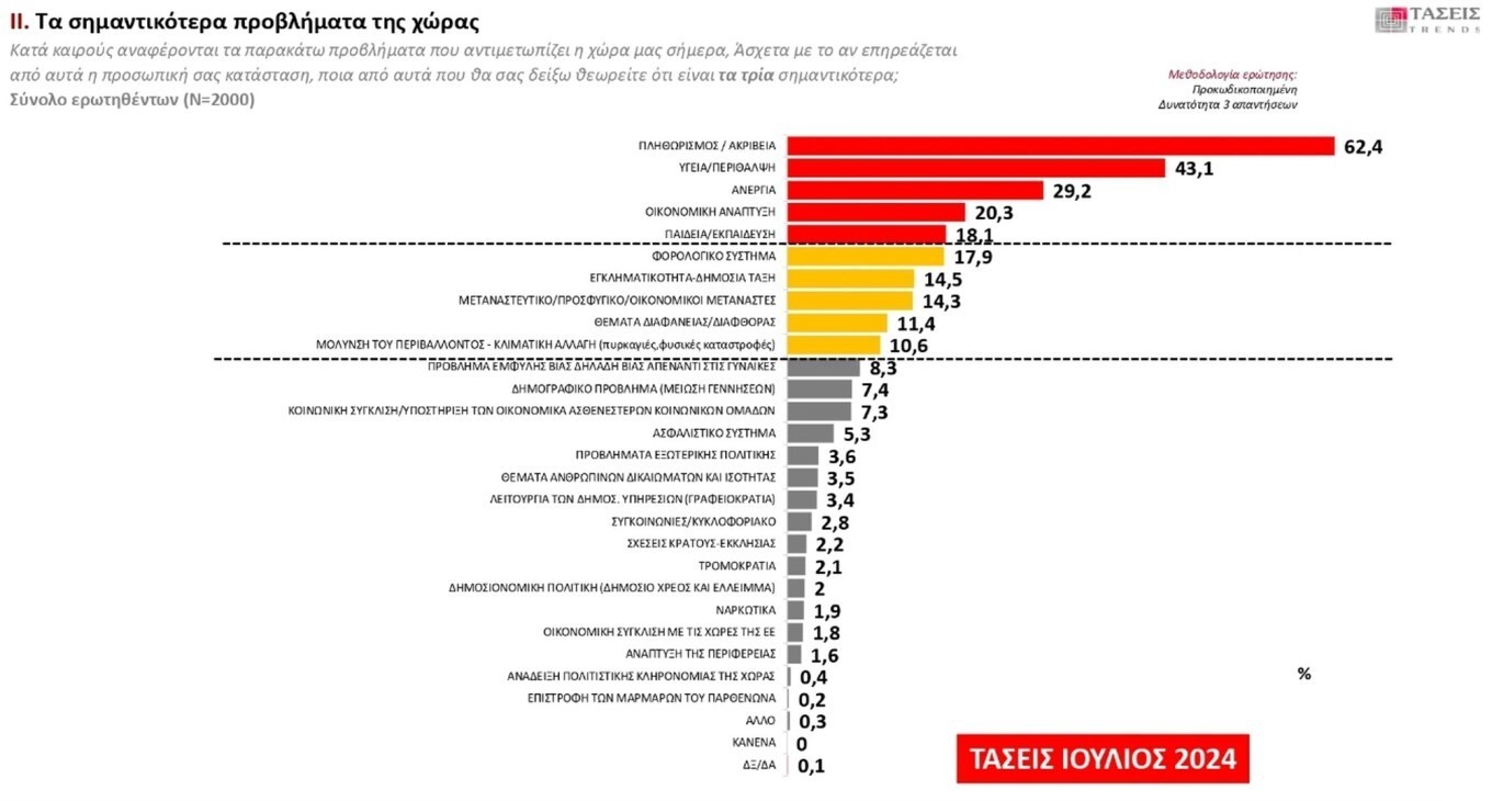 Οι πολίτες θεωρούν ότι τα τρία σημαντικότερα προβλήματα της χώρας είναι: πληθωρισμός/ακρίβεια με 62,4 %, υγεία/περίθαλψη με 43,1 % και ανεργία με 29,2 %.