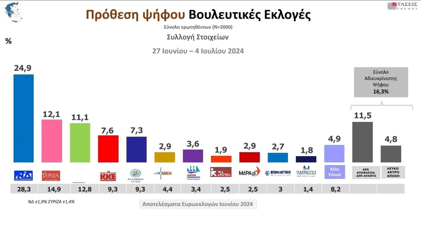 Ειδικότερα, στην πρόθεση ψήφου, η ΝΔ καταγράφει ποσοστό 24,9 % και ακολουθεί ο ΣΥΡΙΖΑ με 12,1 %. Το ΠΑΣΟΚ συγκεντρώνει 11,1 %, το ΚΚΕ 7,6 %, η Ελληνική Λύση 7,3 %, η Πλεύση Ελευθερίας 3,6 %, το ΜέΡΑ 25 2,9%, η Νίκη 2,9 %, η Φωνή Λογικής 2,7 %, η Νέα Αριστερά 1,9% και οι Πατριώτες 1,8 %.