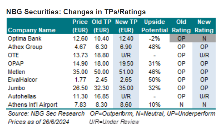 Οι κορυφαίες επιλογές της για το δεύτερο εξάμηνο είναι η Aegean Airlines με τιμή στόχο τα 19,20 ευρώ, η Cenergy Holdings με τιμή στόχο τα 11,00 ευρώ, η Metlen με τιμή στόχο τα 51 ευρώ, η Τιτάν με τιμή στόχο τα 38,20 ευρώ και η Τράπεζα Πειραιώς με τιμή στόχο τα 5,30 ευρώ.