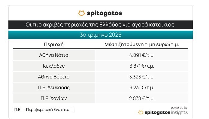 Σταθερά στην πρώτη θέση του top 5 των πιο ακριβών περιοχών της χώρας για αγορά κατοικίας κατά το 3ο τρίμηνο του 2025 βρίσκονται τα Νότια Προάστια με ΜΖΤ πώλησης στα 4.091 ευρώ/τ.μ. Αμέσως μετά ακολουθούν οι Κυκλάδες, τα Βόρεια Προάστια, η Περιφερειακή Ενότητα (Π.Ε.) Λευκάδας και η Π.Ε. Χανίων με τη ΜΖΤ πώλησης κατοικίας να διαμορφώνεται στα 2.878 ευρώ/τ.μ.