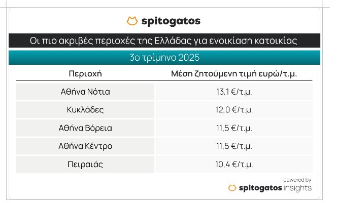 Όσον αφορά τις κατοικίες προς ενοικίαση, και πάλι τα Νότια Προάστια έχουν την πρωτοκαθεδρία στις πιο ακριβές περιοχές της χώρας με τη ΜΖΤ ενοικίασης να ανέρχεται στα 13,1 ευρώ/τ.μ. Ακολουθούν οι Κυκλάδες που έχασαν την πρώτη θέση που κατείχαν κατά το 2ο τρίμηνο του 2025, τα Βόρεια Προάστια της Αθήνας, το κέντρο της Αθήνας και ο Πειραιάς με ΜΖΤ ενοικίασης κατοικίας στα 10,4 ευρώ/τ.μ.