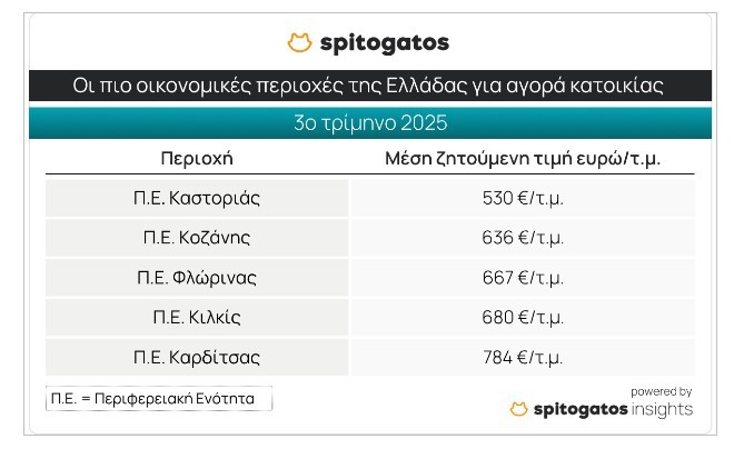Εξετάζοντας τα πιο οικονομικά σημεία της χώρας, οι Π.Ε. Καστοριάς, Κοζάνης, Φλώρινας, Κιλκίς και Καρδίτσας αποτελούν τις 5 πιο οικονομικές επιλογές για αγορά κατοικίας κατά το 3ο τρίμηνο του 2025.