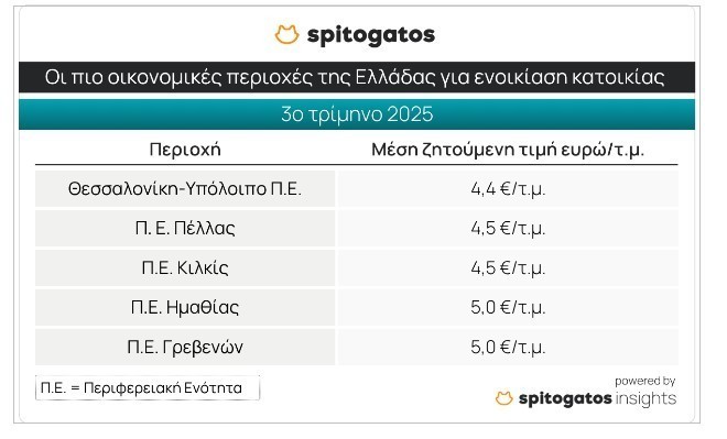 Σε ό,τι αφορά την ενοικίαση κατοικίας, στο top 5 με τις πιο οικονομικές περιοχές της χώρας κατά το 3ο τρίμηνο του 2025 συγκαταλέγονται το υπόλοιπο Π.Ε. Θεσσαλονίκης, οι Π.Ε. Πέλλας, Κιλκίς, Ημαθίας και Γρεβενών.