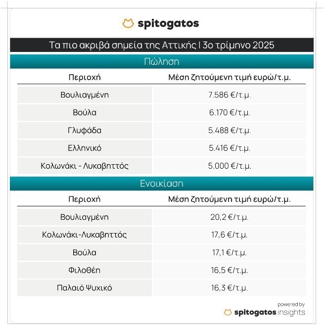 Οι top 5 πιο ακριβές περιοχές για ενοικίαση κατοικίας στην Αττική είναι η Βουλιαγμένη και η Βούλα στα Νότια Προάστια, η περιοχή Κολωνάκι-Λυκαβηττός στο κέντρο της Αθήνας, η Φιλοθέη και το Παλαιό Ψυχικό με ΜΖΤ στα 16,3 ευρώ/τ.μ.