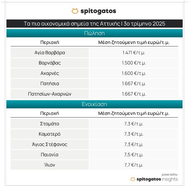 Οικονομικές επιλογές σε ό,τι αφορά την ενοικίαση κατοικίας κατά το 3ο τρίμηνο του 2025 εντοπίζονται σε Σταμάτα (7,3 ευρώ/τ.μ.), Καματερό (7,3 ευρώ/τ.μ.), Άγιο Στέφανο, Παιανία και Ίλιον.