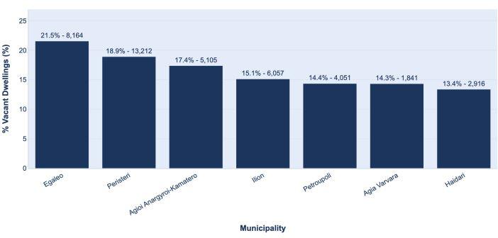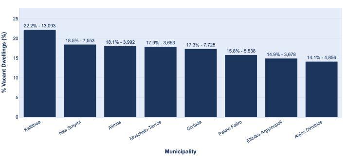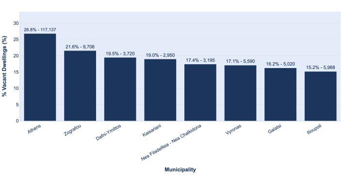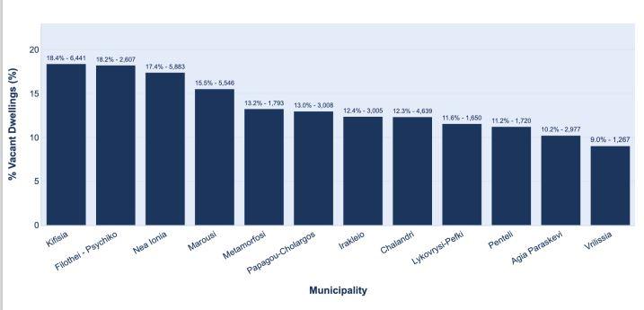 Σχεδόν 120.000 είναι οι κενές κατοικίες στην Αθήνα, σχεδόν όσες ο συνολικός αριθμός όλων των κατοικιών στην Πάτρα, που αποτελεί τον τέταρτο μεγαλύτερο δήμο της Ελλάδας, ενώ πολύ υψηλά ποσοστά παρατηρούνται επίσης και σε άλλες περιοχές της Αττικής, ειδικά στον Πειραιά, αλλά και στους νότιους και δυτικούς δήμους του λεκανοπεδίου, όπου υπάρχει και μεγαλύτερη συγκέντρωση κατοικιών.