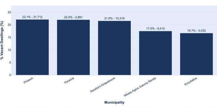 Τα ποσοστά κενών θέσεων στην περιοχή του Πειραιά είναι σταθερά υψηλά, κυμαίνονται μεταξύ 17% και 22%. Τα περισσότερα κλειστά διαμερίσματα έιναι στον Πειραιά με 22,1% ή 21.172 και το Πέραμα με 22% ενώ πιο χαμηλά είναι ο Κορυδαλλός με 16,7%.