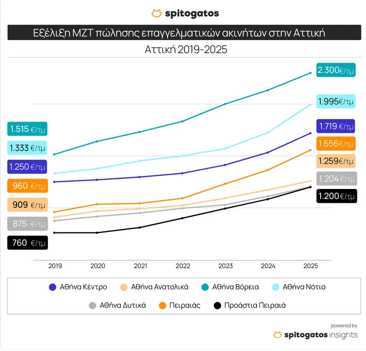 Σύμφωνα με το Spitogatos Insights, στην κατηγορία των επαγγελματικών ακινήτων περιλαμβάνονται ακίνητα όπως γραφεία, καταστήματα, αποθήκες, βιομηχανικοί και βιοτεχνικοί χώροι, ξενοδοχεία, εκθεσιακοί χώροι κ.ά. Λαμβάνοντας υπόψη αυτές τις κατηγορίες και εξετάζοντας την εξέλιξη των Μέσων Ζητούμενων Τιμών (ΜΖΤ) πώλησης επαγγελματικών ακινήτων στην Αττική την περίοδο 2019-2025, παρατηρούνται σημαντικές αυξήσεις στις περισσότερες περιοχές της Αττικής, με τον Πειραιά, τα Προάστιά του αλλά και τα Βόρεια Προάστια να καταγράφουν τις υψηλότερες αυξήσεις στις ΜΖΤ πώλησης – της τάξης του 62,1%, 57,9% και 51,8% αντίστοιχα.