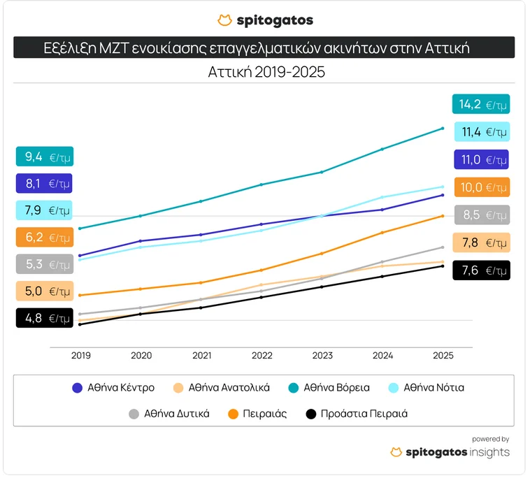 Σε ό,τι αφορά την εξέλιξη των ΜΖΤ ενοικίασης επαγγελματικών ακινήτων κατά την ίδια περίοδο 2019-2025, παρατηρείται επίσης αύξηση των μέσων ζητούμενων τιμών σε όλες τις περιοχές της Αττικής. Οι σημαντικότερες αυξήσεις σημειώνονται στα Προάστια του Πειραιά (61,2%), στα Δυτικά Προάστια (59,5%) και στον Πειραιά (59,2%).