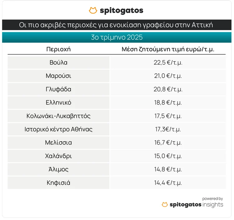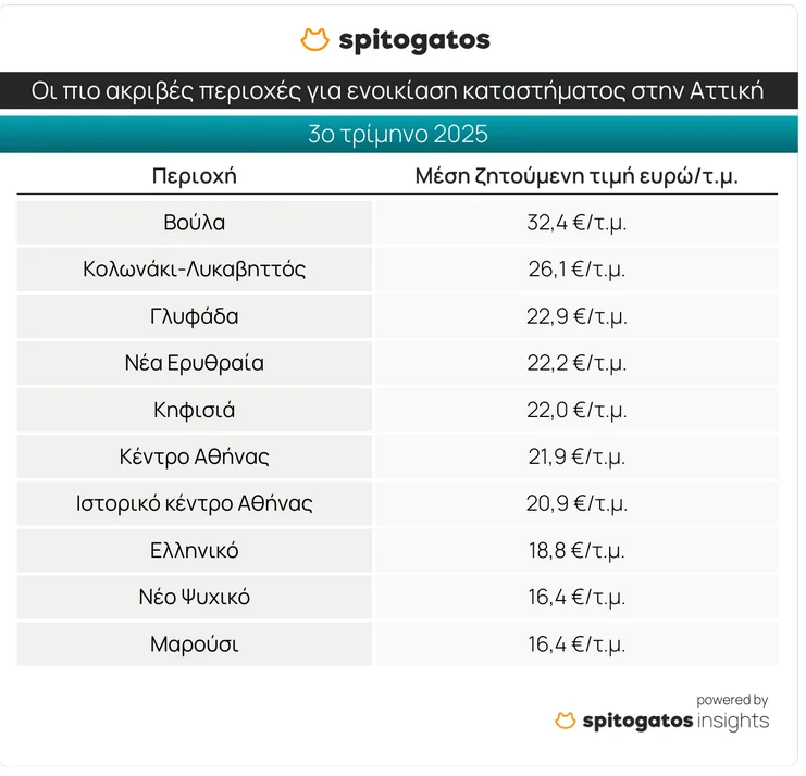 Οι πιο ακριβές περιοχές της Αττικής για το 3ο τρίμηνο του 2025 όσον αφορά την ενοικίαση καταστήματος είναι η Βούλα, με ΜΖΤ ενοικίασης 32,4 ευρώ/τ.μ., η περιοχή Κολωνάκι-Λυκαβηττός (26,1ευρώ/τ.μ.) και η Γλυφάδα με ΜΖΤ που φτάνει τα 22,9 ευρώ/τ.μ.