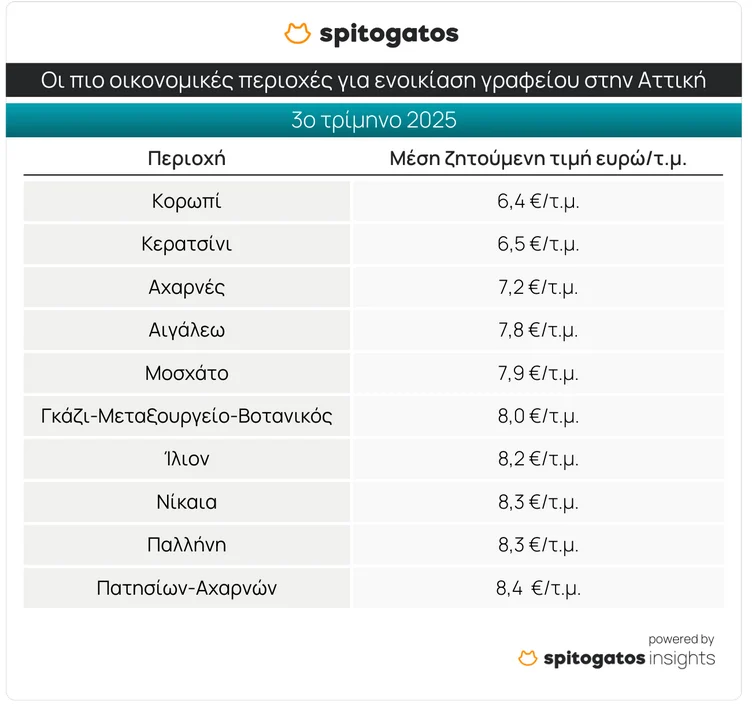 Οι πιο οικονομικές περιοχές της Αττικής για ενοικίαση γραφείου βρίσκονται στα Προάστια του Πειραιά (Κερατσίνι, Μοσχάτο, Νίκαια), στην Ανατολική Αττική (Κορωπί, Παλλήνη) και στα Δυτικά Προάστια (Αχαρνές, Αιγάλεω, Ίλιον) αλλά και στο κέντρο της Αθήνας στην περιοχή Πατησίων-Αχαρνών.