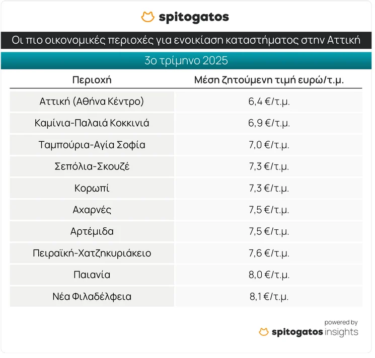 Αντίθετα, στις πιο οικονομικές περιοχές της Αττικής για ενοικίαση καταστήματος για το 3ο τρίμηνο του 2025 κατατάσσονται περιοχές της Δυτικής Αττικής, του Πειραιά, της Ανατολικής Αττικής και του κέντρου της Αθήνας. Συγκεκριμένα, οι πιο οικονομικές περιοχές για ενοικίαση καταστήματος είναι η Αττική, τα Καμίνια-Παλαιά Κοκκινιά και η περιοχή Ταμπούρια-Αγία Σοφία.
