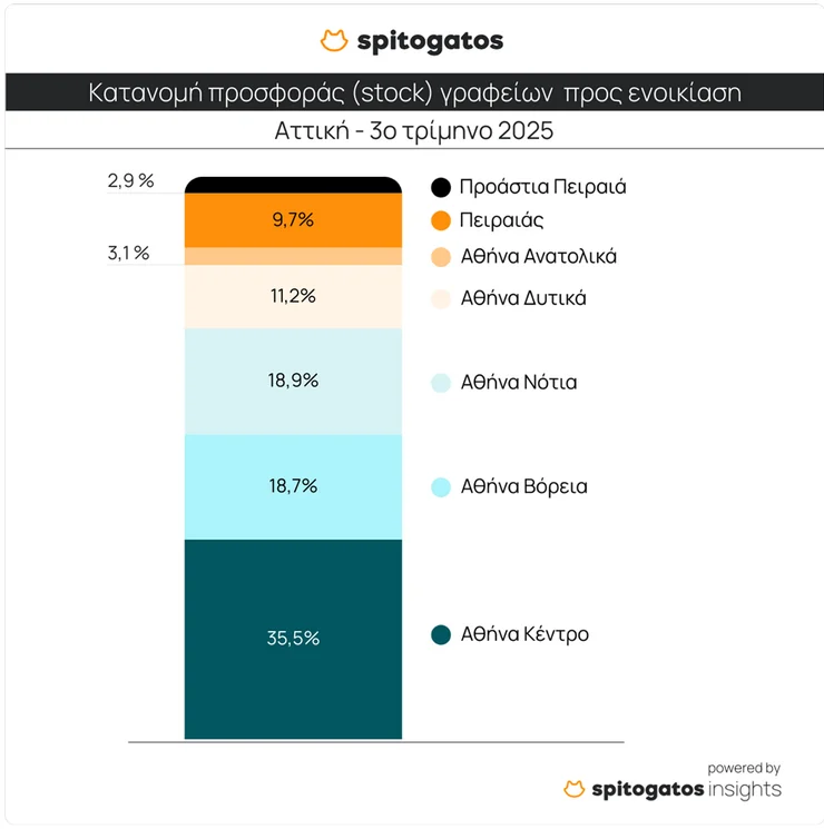 Όσον αφορά τα γραφεία προς ενοικίαση στην Αττική, πάνω από το 35,5% του διαθέσιμου stock βρίσκεται στον Δήμο Αθηναίων, ενώ περίπου 18,9% και 18,7% καταγράφεται στα Νότια και Βόρεια Προάστια αντίστοιχα. Στα Προάστια του Πειραιά και στην Ανατολική Αττική εντοπίζονται τα μικρότερα ποσοστά, μόλις 2-3%.