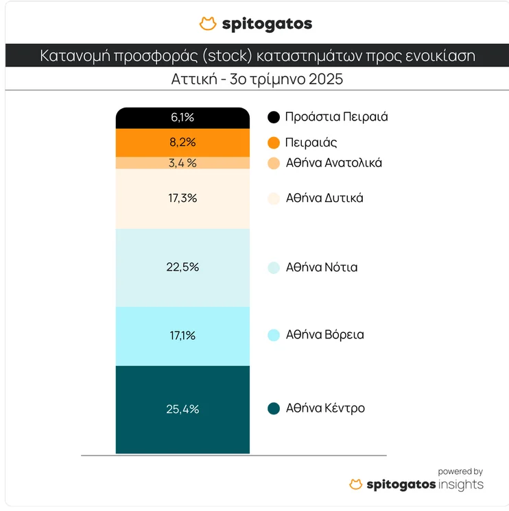 Σε ό,τι αφορά την προσφορά (stock) καταστημάτων προς ενοικίαση στην Αττική, πάνω από το 25% του διαθέσιμου stock βρίσκεται στον Δήμο Αθηναίων, ενώ τα Νότια Προάστια ακολουθούν με 22,5%. Ακολουθούν Δυτικά και Βόρεια Προάστια ενώ μικρότερα ποσοστά της προσφοράς (stock) καταστημάτων προς ενοικίαση της τάξης του 3-9% συναντώνται σε Πειραιά και τα Προάστιά του καθώς και στην Ανατολική Αττική.