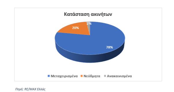 Όσον αφορά στην κατάσταση των οικιστικών ακινήτων, η συντριπτική πλειονότητα των ξένων αγοραστών (ποσοστό 78% επί του συνόλου) επέλεξε μεταχειρισμένα ακίνητα. Τα νεόδμητα καλύπτουν το 20% των αγορών και τα ανακαινισμένα μόλις το 2%.