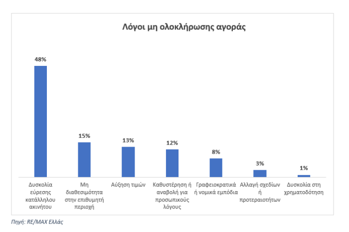 Σύμφωνα με την έρευνα της RE/MAX Ελλάς, η εύρεση του κατάλληλου ακινήτου αποτελεί καθοριστικό παράγοντα ως προς την ολοκλήρωση της συναλλαγής απόκτησης ενός ακινήτου από τους ενδιαφερόμενους αγοραστές, με το 48% να επαναξιολογεί τη διαδικασία όταν δεν εντοπίζει άμεσα το ακίνητο που επιθυμεί.