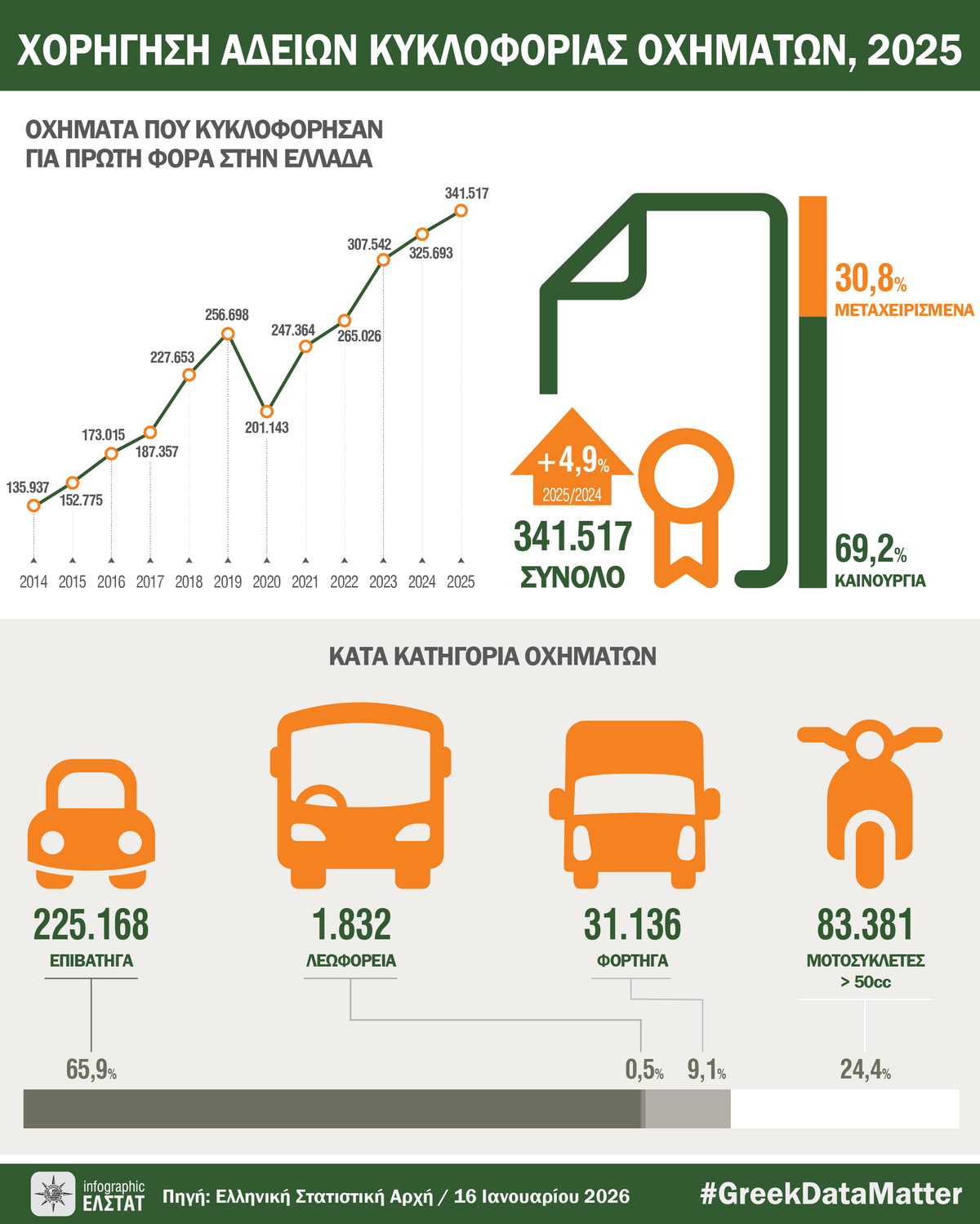 Την περίοδο Ιανουαρίου - Δεκεμβρίου 2025 κυκλοφόρησαν για πρώτη φορά 258.136 αυτοκίνητα (καινούργια ή μεταχειρισμένα εξωτερικού) έναντι 243.796 που κυκλοφόρησαν την αντίστοιχη περίοδο του έτους 2024, παρουσιάζοντας αύξηση 5,9%. Αύξηση 2,4% είχε παρουσιάσει το δωδεκάμηνο Ιανουαρίου - Δεκεμβρίου του 2024 σε σχέση με το αντίστοιχο του 2023.