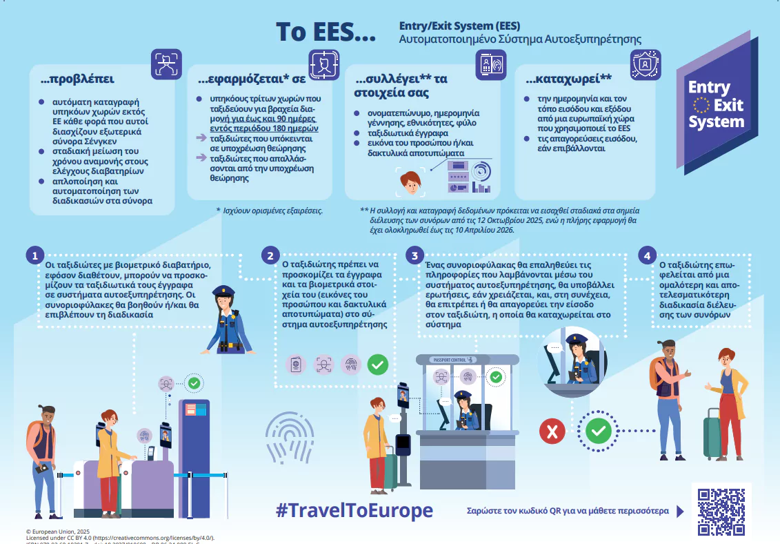 Από την ερχόμενη Κυριακή τίθεται σε ισχύ για την Ελλάδα και τα κράτη του χώρου Σένγκεν το νέο Σύστημα Εισόδου-Εξόδου (Entry-Exit System), που αντικαθιστά τη σφράγιση των διαβατηρίων με την ηλεκτρονική καταγραφή και αποθήκευση των στοιχείων εισόδου και εξόδου των ταξιδιωτών.