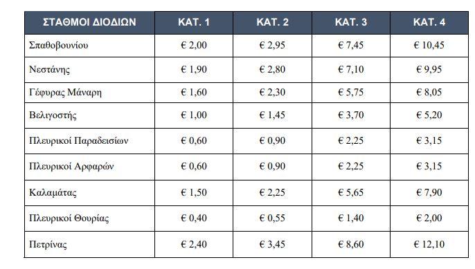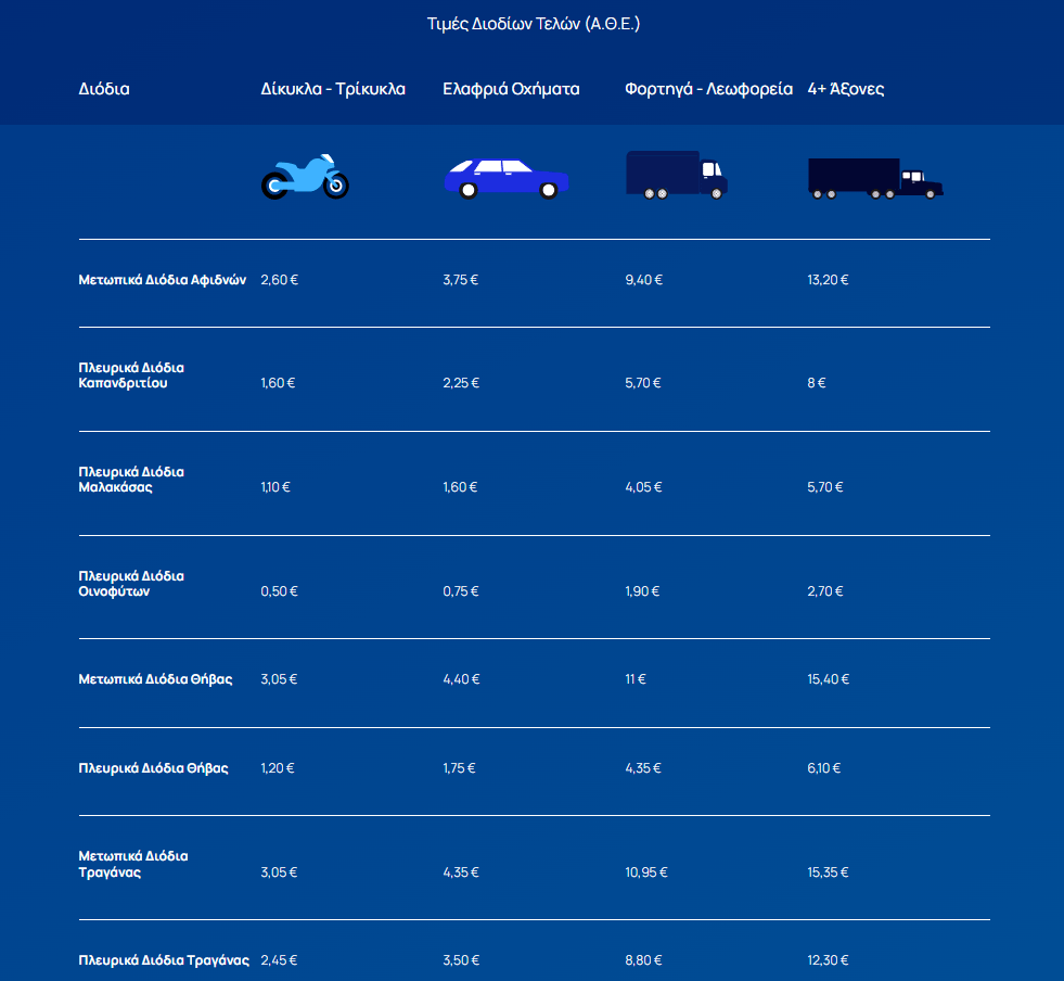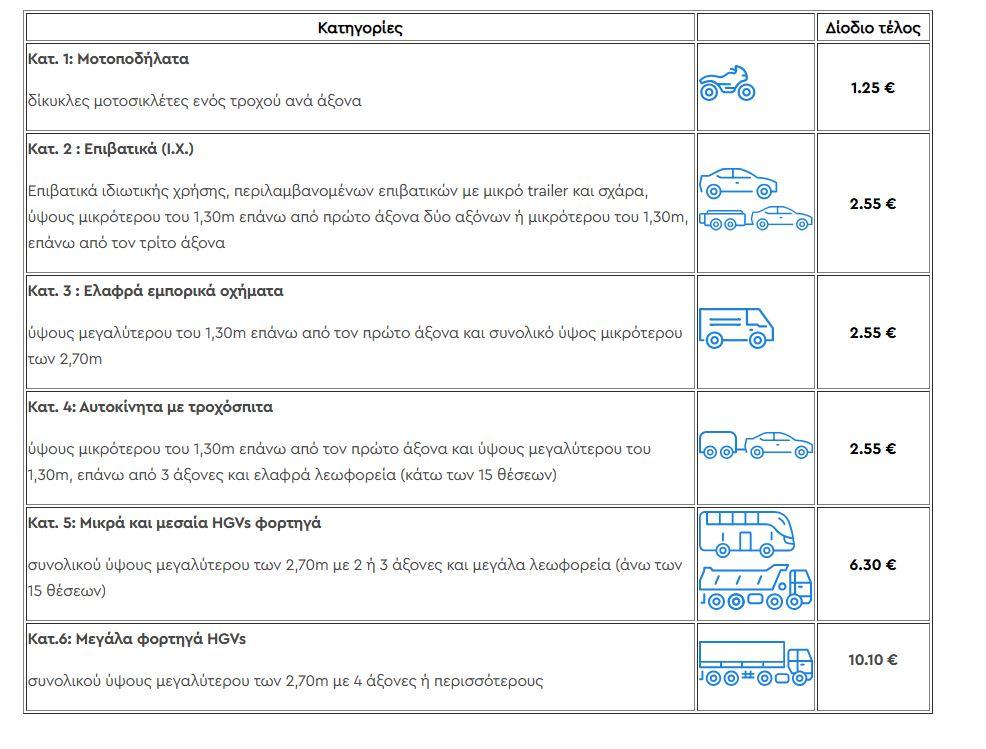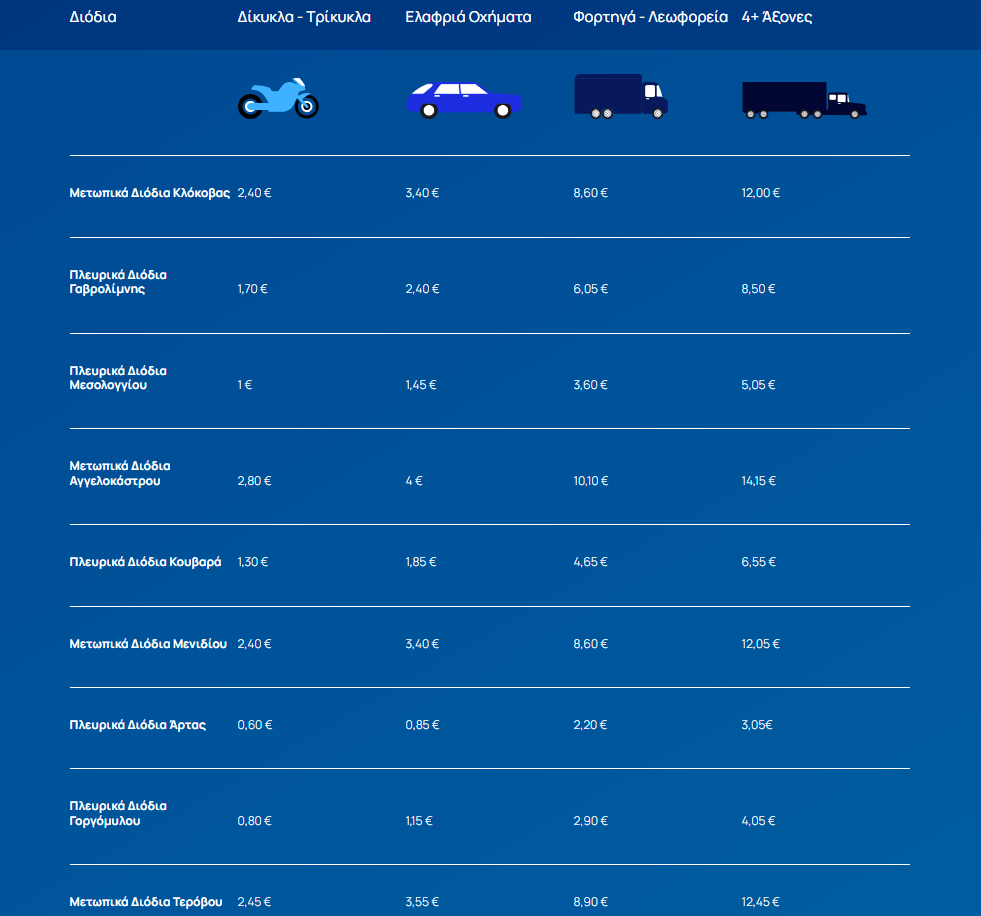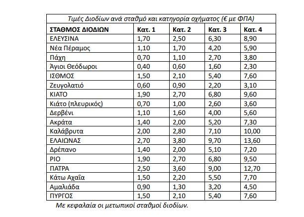 Σημειώνεται ότι για τα διόδια σε Νέα Οδό και Ιονία Οδό ισχύουν τα παρακάτω: