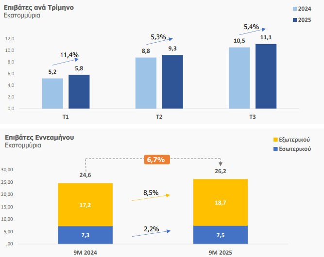 Η επιβατική κίνηση το εννεάμηνο ανήλθε σε 26,1 εκατ. επιβάτες, αυξημένη 6,7% σε σχέση με το εννεάμηνο του 2024.
