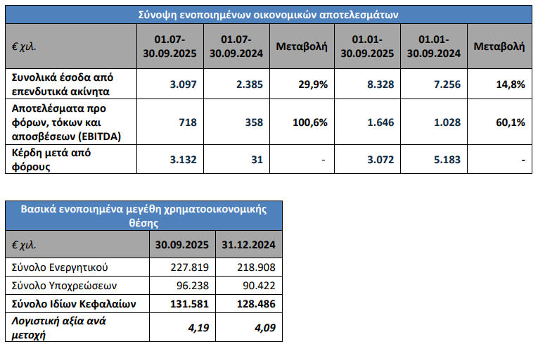 Τα ενοποιημένα κέρδη μετά φόρων για το γ’ τρίμηνο του 2025 διαμορφώθηκαν σε € 3,1 εκ. έναντι κερδών € 31 χιλ. την αντίστοιχη περίοδο του 2024. Αφαιρουμένων των κερδών από την αναπροσαρμογή της εύλογης αξίας και την πώληση επενδυτικών ακινήτων της RKB ύψους € 2,6 εκ. το γ’ τρίμηνο του 2025 και € 150 χιλ. την αντίστοιχη περίοδο του 2024, τα ενοποιημένα αποτελέσματα ανέρχονται σε κέρδη € 501 χιλ. το γ’ τρίμηνο του 2025 έναντι ζημιών € 119 χιλ. την αντίστοιχη περίοδο του 2024.