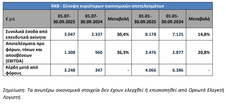 Η θυγατρική RKB συνέχισε για ένα ακόμη τρίμηνο την σημαντική βελτίωση των επιδόσεων της. Συγκεκριμένα για το γ’ τρίμηνο και το εννιάμηνο του 2025 εμφάνισε αύξηση συνολικών εσόδων από επενδυτικά ακίνητα 30,4% και 14,8% αντίστοιχα, και σημαντική βελτίωση του EBITDA κατά 36,3% και 20,8% αντίστοιχα. Τα κέρδη μετά φόρων για το γ’ τρίμηνο του 2025 διαμορφώθηκαν σε € 3,2 εκ. έναντι κερδών € 347 χιλ. την αντίστοιχη περίοδο του 2024. Αφαιρουμένων των κερδών από την αναπροσαρμογή της εύλογης αξίας και την πώληση επενδυτικών ακινήτων ύψους € 2,6 εκ. το γ’ τρίμηνο του 2025 και € 150 χιλ. την αντίστοιχη περίοδο του του 2024, τα κέρδη της RKB ανέρχονται σε € 617 χιλ. το γ’ τρίμηνο του 2025 έναντι 197 χιλ. την αντίστοιχη περίοδο του 2024 σημειώνοντας σημαντική άνοδο κατά 213,2%. Τα κέρδη μετά φόρων για το εννiάμηνο του 2025 διαμορφώθηκαν σε € 4,1 εκ. έναντι κερδών € 6,4 εκ. την αντίστοιχη περίοδο του 2024. Αφαιρουμένων των κερδών από την αναπροσαρμογή της εύλογης αξίας και την πώληση επενδυτικών ακινήτων που αναφέρονται παραπάνω καθώς επίσης και των έκτακτων κερδών ύψους € 5,8 εκ. που προέκυψαν από την αναδιάρθρωση του τραπεζικού δανεισμού της RKB κατά το α’ εξάμηνο του 2024, τα κέρδη της εταιρείας, ανέρχονται σε € 1,4 εκ. το εννιάμηνο του 2025 και € 485 χιλ. το εννιάμηνο του 2024 σημειώνοντας σημαντική άνοδο κατά 195,5%.