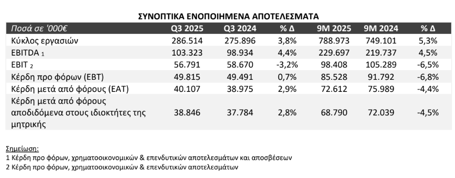 Σε επίπεδο εννεάμηνου , ο Κύκλος Εργασιών αυξήθηκε κατά 5,3% και ανήλθε σε €789 εκατ.. Το ΕBITDA για το εννεάμηνο του 2025 ανήλθε σε €229,7 εκατ., παρουσιάζοντας αύξηση 4,5%, ενώ τα Κέρδη μετά από Φόρους (ΕΑΤ) διαμορφώθηκαν σε €72,6 εκατ..