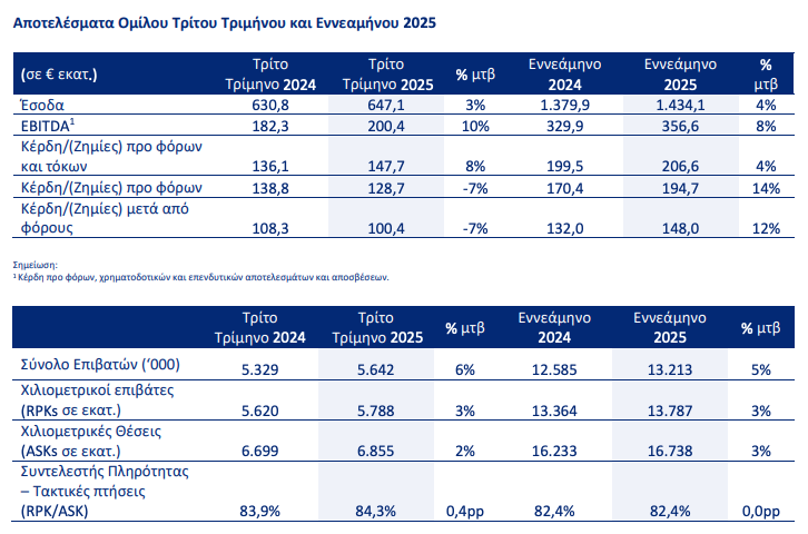 Ο ενοποιημένος κύκλος εργασιών για το Γ’ τρίμηνο ανήλθε σε €647,1 εκατ., τα Κέρδη EBITDA ανήλθαν σε €200,4 εκατ. ενισχυμένα κατά 10%, και η λειτουργική κερδοφορία EBIT ανήλθε σε €147,7 εκατ. αυξημένη κατά 8% αντίστοιχα σε σχέση με το αντίστοιχο τρίμηνο του 2024. Τα Κέρδη προ Φόρων του τρίμηνου και τα Κέρδη μετά από Φόρους διαμορφώθηκαν σε €128,7 εκατ. και σε €100,4 εκατ. αντίστοιχα με μικρή κάμψη 7%, παρά την αύξηση της λειτουργικής κερδοφορίας κυρίως λόγω της μερικής ανάκαμψης του δολαρίου κατά το Γ’ τρίμηνο, που επηρέασε τις αποτιμήσεις των μελλοντικών υποχρεώσεων από μισθώσεις των αεροσκαφών στον ισολογισμό του Ομίλου.