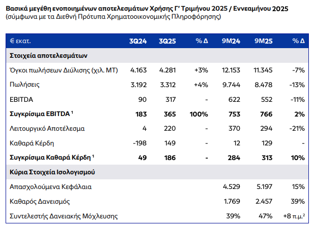Oι πωλήσεις προϊόντων διύλισης κατά το Γ’ Τρίμηνο 2025 διαμορφώθηκαν σε ιστορικά υψηλά επίπεδα. Η σημαντική βελτίωση των διεθνών περιθωρίων διύλισης, στο υψηλότερο των τελευταίων δύο ετών, σε συνδυασμό με την καλή λειτουργική απόδοση, οδήγησαν σε ενίσχυση των οικονομικών αποτελεσμάτων. Ταυτόχρονα, οι βελτιωμένες επιδόσεις της Εμπορίας, τόσο στην εγχώρια όσο και στη διεθνή αγορά, ενίσχυσαν τη συνεισφορά του κλάδου στο μέγιστο επίπεδο όλων των εποχών. Ως αποτέλεσμα, η κερδοφορία του Εννεαμήνου ξεπέρασε αυτή της αντίστοιχης περιόδου του 2024, με τα Συγκρίσιμα Κέρδη EBITDA να διαμορφώνονται σε €766 εκατ., παρά το πιο αδύναμο Α’ Εξάμηνο.