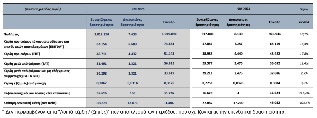 Οι πωλήσεις κυμάνθηκαν ελαφρώς υψηλότερα (+1,8%) από πέρυσι, ενώ τα κέρδη προ φόρων αυξήθηκαν κατά περίπου 8%, λόγω βελτίωσης της παραγωγικότητας της εταιρείας. Ο ρυθμός ανάπτυξης της δραστηριότητας κατά το 3οτρίμηνο παρουσίασε αύξηση άνω 5%.