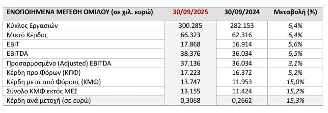 Κατά το εννεάμηνο του 2025, η λειτουργική κερδοφορία EBITDA ανήλθε σε 38,4 εκατ. ευρώ, αυξημένη κατά 6,5% συγκριτικά με το εννεάμηνο του 2024, όπου το EBITDA είχε ανέλθει σε 36,0 εκατ. ευρώ. Σε επίπεδο προσαρμοσμένου EBITDA, η αύξηση εκτιμάται σε 3,1%, βελτίωση που αποκτά ιδιαίτερη σημασία δεδομένης της μειωμένης ζήτησης και της αυξημένης κοστολογικής βάσης. Επισημαίνεται ότι το κόστος ενέργειας, σε συγκρίσιμους όρους, αυξήθηκε κατά περίπου 2,1 εκατ. ευρώ σε σχέση με το περσινό εννεάμηνο.