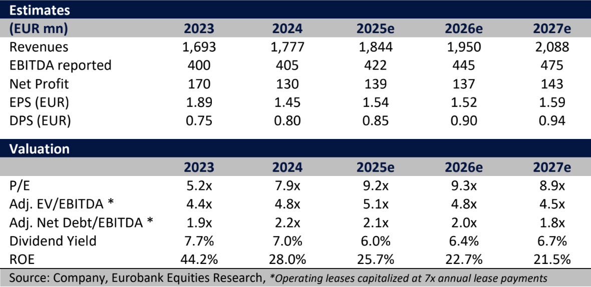 Η Aegean διατηρεί ισχυρή χρηματοοικονομική θέση, με δείκτη net debt/EBITDA κάτω από 2x το 2025, παρά τις συνεχιζόμενες επενδύσεις σε στόλο, με μείωση στο 1x μετά το 2027. Η ισχυρή ικανότητα δημιουργίας ταμειακών ροών -που παραδοσιακά μετατρέπει το 45-50% του EBITDA σε ελεύθερες ταμειακές ροές- παρέχει περιθώρια για συνέχιση των διανομών προς τους μετόχους. Από την επαναφορά των μερισμάτων το 2023, η Aegean διατηρεί ένα ελκυστικό προφίλ πληρωμών. Υποθέτοντας αναλογία πληρωμής (payout ratio) άνω του 50%, σε συντονισμό με το ιστορικό 60-90%, η Eurobank Equities αναμένει μερισματική απόδοση της τάξης του 6-7%, χαρακτηρίζοντας τη μετοχή ως solid dividend play.