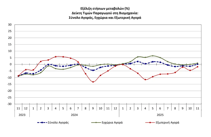 Η αύξηση του Γενικού Δείκτη Τιμών Παραγωγού κατά 0,1%, τον μήνα Νοέμβριο 2025, σε σύγκριση με τον αντίστοιχο δείκτη του Νοεμβρίου 2024, οφείλεται στις μεταβολές των δεικτών των επιμέρους αγορών, δηλαδή: