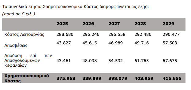 Το συνολικό ετήσιο χρηματοοικονομικό κόστος διαμορφώνεται σε 375,9 εκατ. ευρώ για το 2025 και αυξάνεται σταδιακά έως τα 415,7 εκατ. ευρώ το 2029. Η αύξηση αυτή, όπως επισημαίνεται, αντανακλά κυρίως την ένταξη νέων επενδύσεων στα απασχολούμενα κεφάλαια, καθώς και την αύξηση των αποσβέσεων.