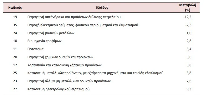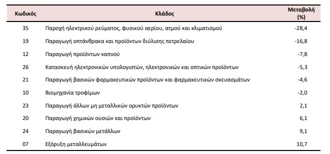 Ειδικότερα, στη μείωση αυτή συνέβαλαν κυρίως οι μεταβολές των δεικτών των κλάδων: