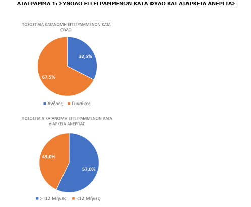 Το σύνολο των εγγεγραμμένων στο μητρώο της ΔΥΠΑ για τον μήνα Σεπτέμβριο 2025, ανήλθε σε 720.039 άτομα. Από αυτά 410.662 (ποσοστό 57,0%) άτομα είναι εγγεγραμμένα στο μητρώο της ΔΥΠΑ για χρονικό διάστημα ίσο ή και περισσότερο των 12 μηνών και 309.377 (ποσοστό 43,0%) είναι εγγεγραμμένα στο μητρώο της ΔΥΠΑ για χρονικό διάστημα μικρότερο των 12 μηνών.