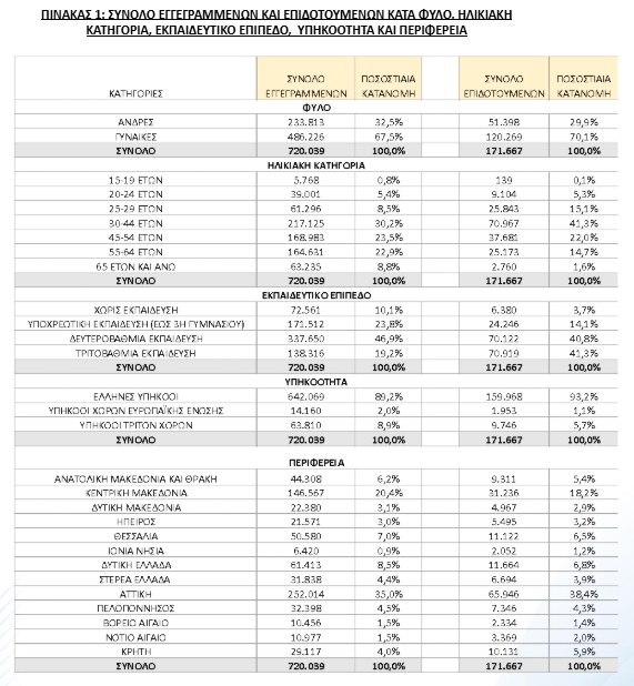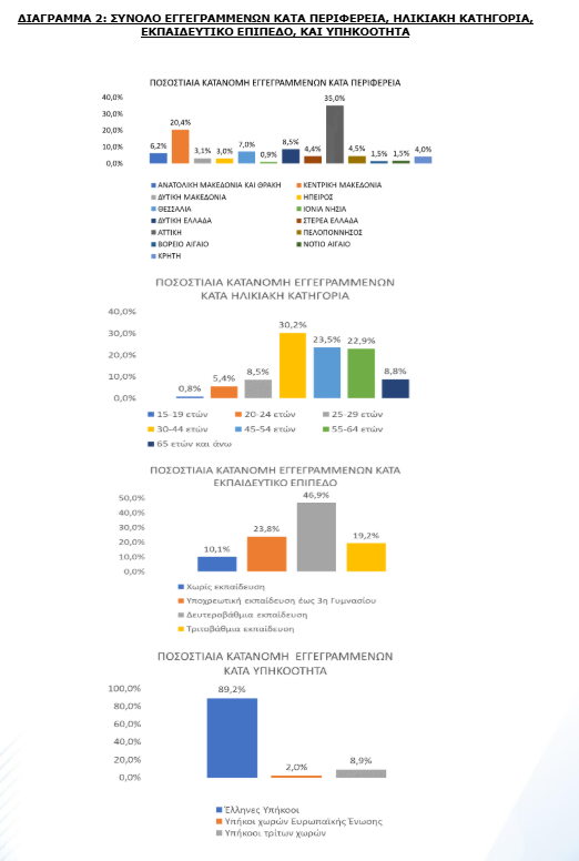 Μεταξύ των Περιφερειών της Χώρας η Περιφέρεια Αττικής και η Περιφέρεια Κεντρικής Μακεδονίας καταγράφουν τον μεγαλύτερο αριθμό εγγεγραμμένων ο οποίος ανέρχεται σε 252.014 άτομα (ποσοστό 35,0%) και 146.567 άτομα (ποσοστό 20,4%) αντίστοιχα.