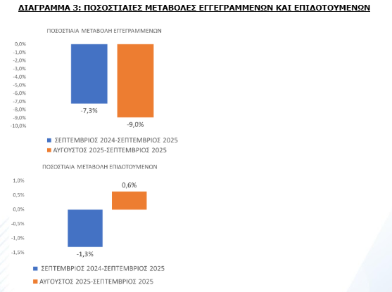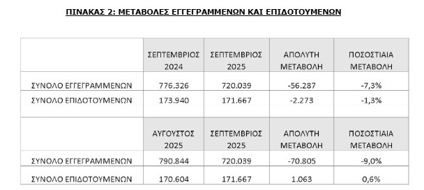 Στον πίνακα 2 παρουσιάζονται οι μεταβολές των εγγεγραμμένων και των επιδοτούμενων από τον αντίστοιχο μήνα του προηγούμενου έτους Σεπτέμβριο 2024 καθώς και από τον προηγούμενο μήνα Αύγουστο 2025.