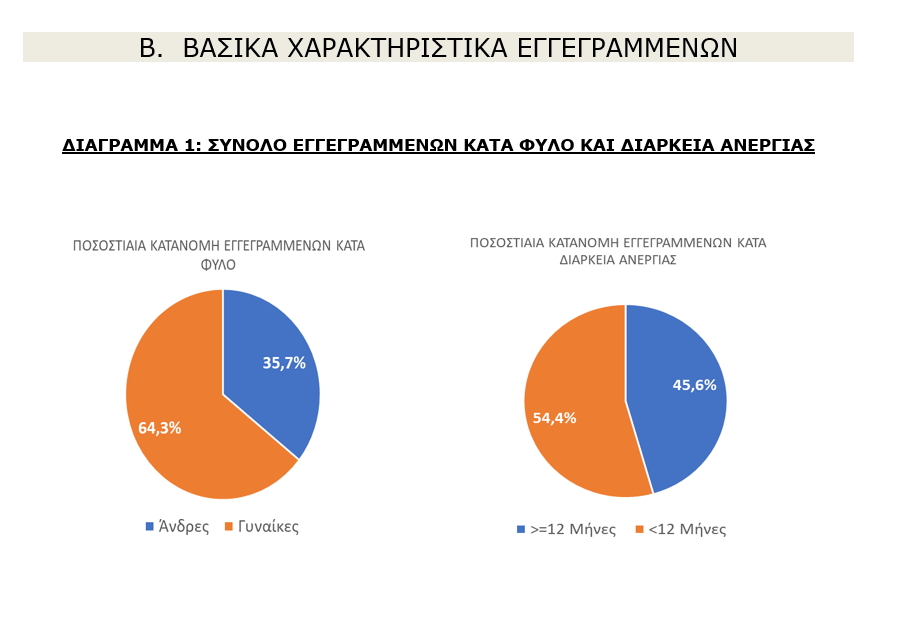 Από αυτά 417.534 (ποσοστό 45,6%) άτομα είναι εγγεγραμμένα στο μητρώο της ΔΥΠΑ για χρονικό διάστημα ίσο ή και περισσότερο των 12 μηνών και 498.355 (ποσοστό 54,4%) είναι εγγεγραμμένα στο μητρώο της ΔΥΠΑ για χρονικό διάστημα μικρότερο των 12 μηνών.