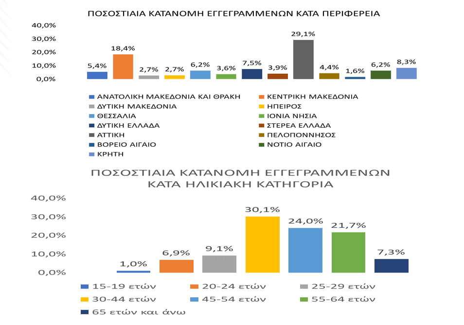 Μεταξύ των Περιφερειών της Χώρας η Περιφέρεια Αττικής και η Περιφέρεια Κεντρικής Μακεδονίας καταγράφουν τον μεγαλύτερο αριθμό εγγεγραμμένων ο οποίος ανέρχεται σε 266.328 άτομα (ποσοστό 29,1%) και 168.312 άτομα (ποσοστό 18,4%) αντίστοιχα.