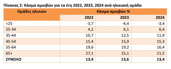 Το μεγαλύτερο Χάσμα Αμοιβών παρατηρείται στην ηλικιακή ομάδα 65+, με 27,1%, 25,1% και 21,5% για τα έτη 2022, 2023 και 2024 αντίστοιχα. Το μικρότερο μισθολογικό χάσμα και με αντίθετο πρόσημο (δηλαδή οι ακαθάριστες ωριαίες αποδοχές των ανδρών είναι χαμηλότερες από των γυναικών) καταγράφεται στην ηλικιακή ομάδα κάτω των 25 ετών, με -3,7%, -4,4% και -3,4% για τα έτη 2022, 2023 και 2024 αντίστοιχα.