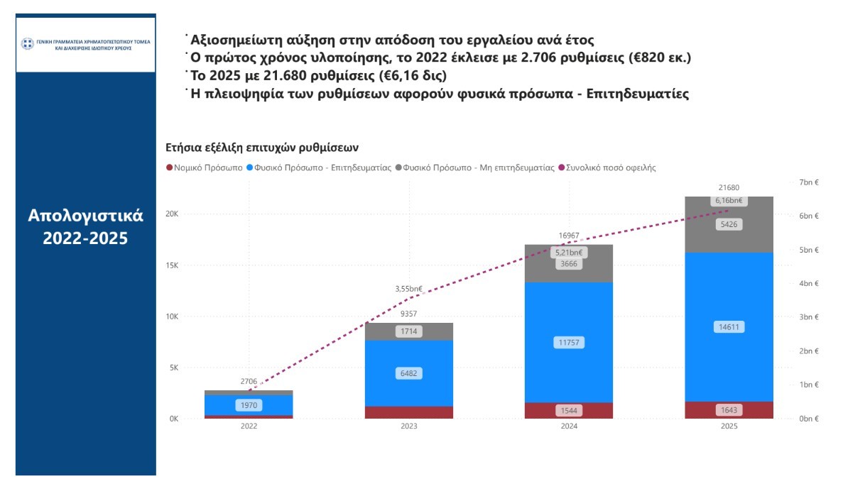 O 4ος χρόνος εφαρμογής του εργαλείου κλείνει με θεαματική αύξηση σε σχέση με τα προηγούμενα έτη. Αξίζει να σημειωθεί ότι κατά το 2022, πρώτο χρόνο λειτουργίας, επετεύχθησαν 2.706 ρυθμίσεις – αριθμός που σήμερα είναι πιο κοντά στις μηνιαίες ρυθμίσεις. Ενώ εντός του 2025 σημειώθηκαν 21.680 επιτυχείς αναδιαρθρώσεις.