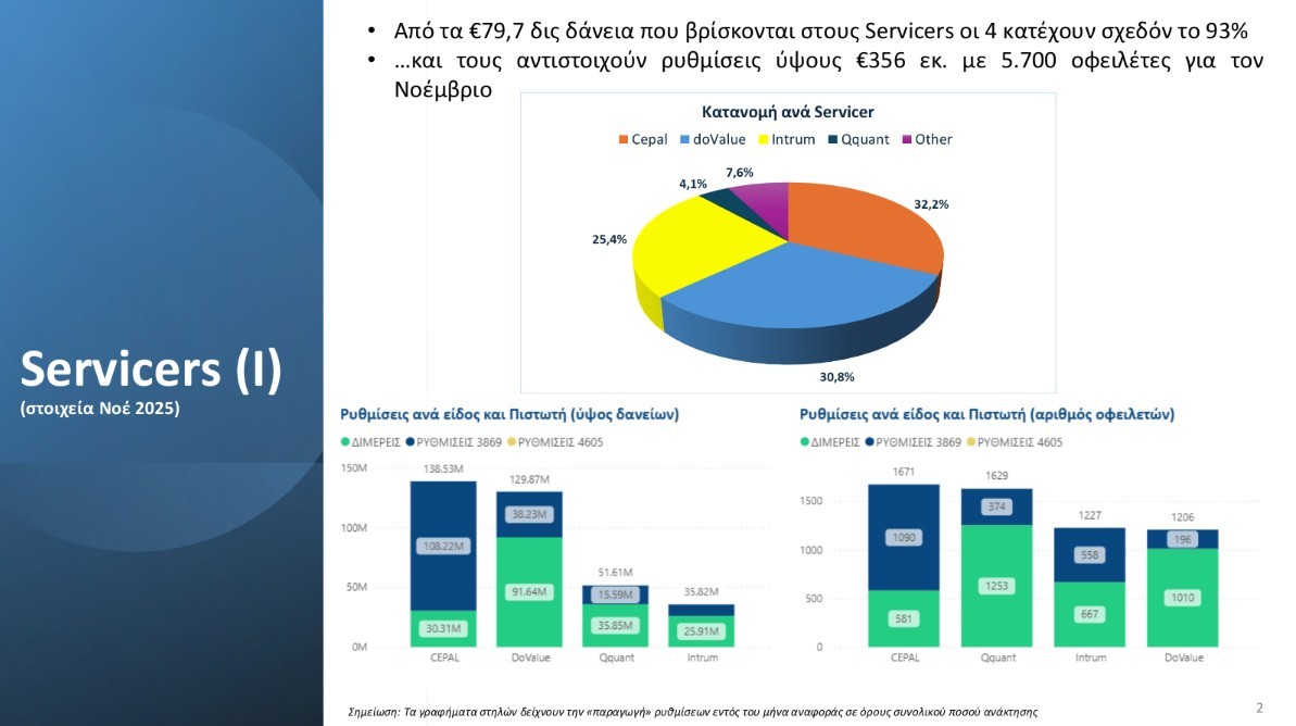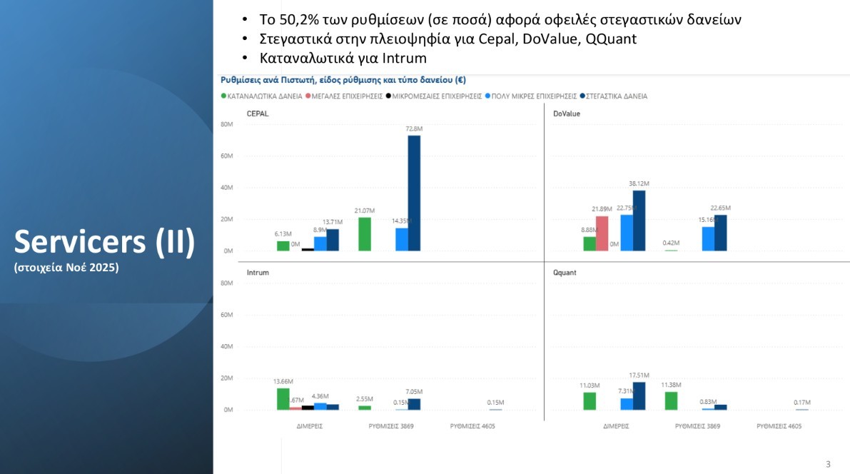 Στην ίδια κατεύθυνση, οι διμερείς ρυθμίσεις που υλοποιήθηκαν τον Νοέμβριο 2025 με τους 4 μεγαλύτερους Servicers (Intrum, Cepal, DoValue, Qquant) συνεχίζουν να παρουσιάζουν θετική δυναμική. Τον μήνα Νοέμβριο καταγράφηκαν ρυθμίσεις συνολικού ύψους 356 εκ. ευρώ, οι οποίες αντιστοιχούν σε 5.700 οφειλέτες, με την με την πλειοψηφία αυτών να αφορά στεγαστικά δάνεια.