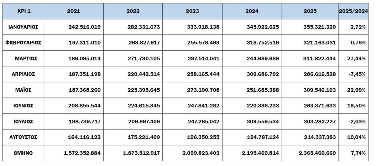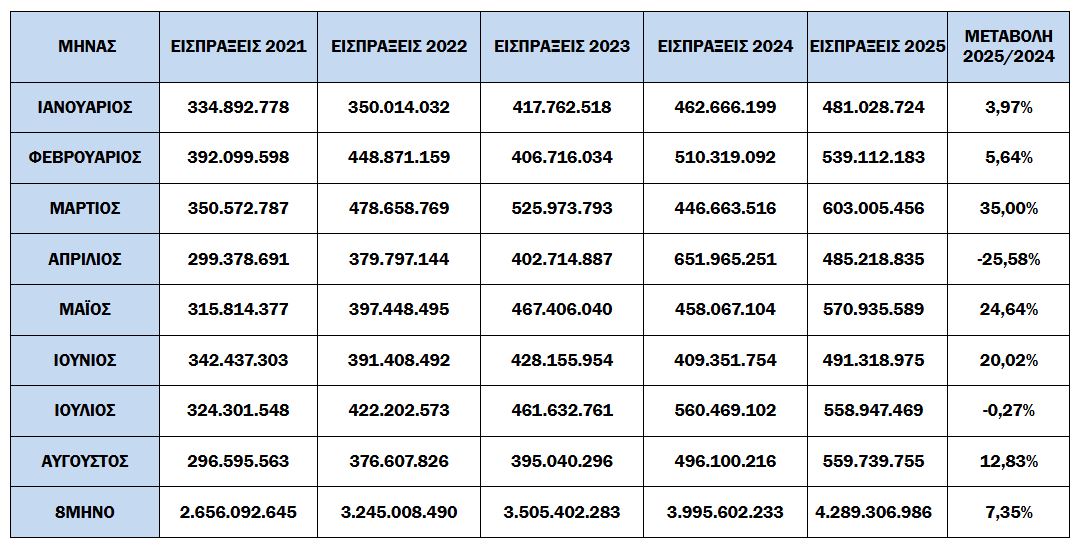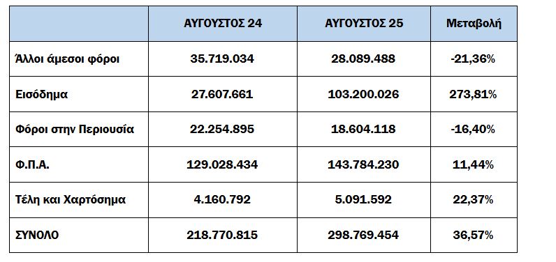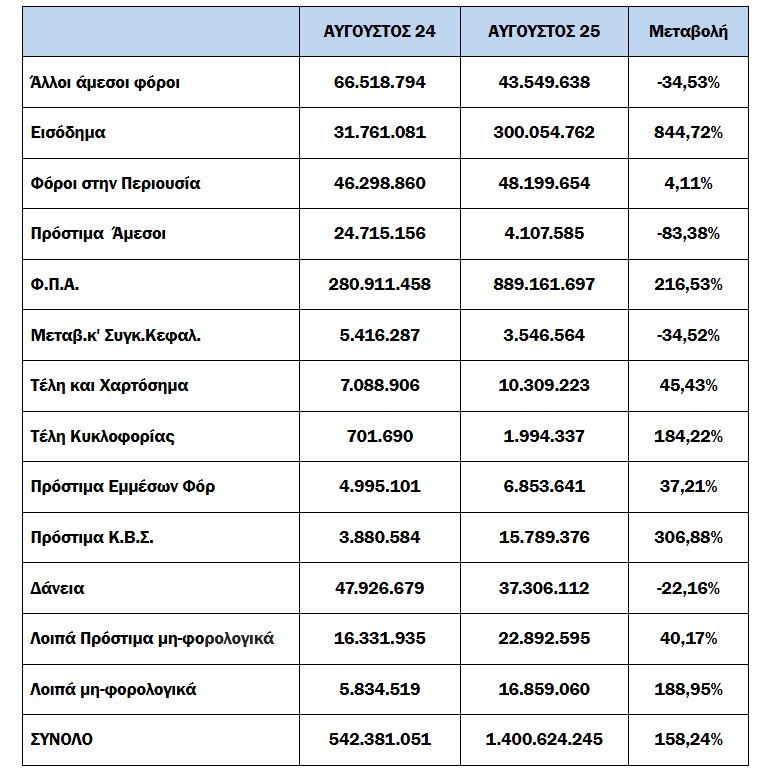 -Για το 8μηνο, οι συνολικές εισπράξεις έναντι νέου ληξιπρόθεσμου (εκτός 10 ΜΦΚ) έφτασαν τα 1,861 εκατ. ευρώ, ενώ την αντίστοιχη περίοδο του 2024 έφτασαν τα 1,663 εκατ. ευρώ.
