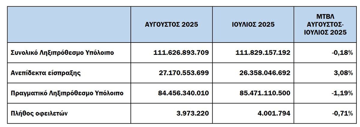 Σε σχέση με την αντίστοιχη περίοδο του 2024, ο αριθμός των οφειλετών παρουσιάζει μείωση κατά 1,02% (3.973.220 πλήθος οφειλετών τον Αύγουστο του 2025 έναντι 4.014.207 το 2024).