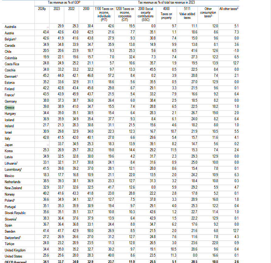 *Το 2024 τα φορολογικά έσοδα της Ελλάδας ανήλθαν στο 39,8% του ΑΕΠ, υψηλότερα από το 38,9% του 2023 και αρκετά υψηλότερα από τον μέσο όρο του ΟΟΣΑ, που διαμορφώθηκε στο 34,1%, με αποτέλεσμα η Ελλάδα να κατατάσσεται στη 10η θέση ως προς το ύψος της φορολογικής επιβάρυνσης.