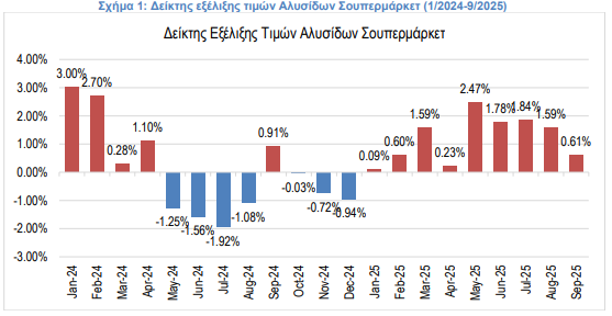 Ειδικότερα, ο πληθωρισμός στις αλυσίδες σουπερμάρκετ είναι της τάξης του +0,61% τον Σεπτέμβριο 2025 σε σχέση με τον Σεπτέμβριο 2024, με τάση σταδιακής αποκλιμάκωσης σε χαμηλότερα επίπεδα σε σχέση με τους προηγούμενους 4 μήνες. Συμπληρωματικά, οι τιμές του Σεπτεμβρίου 2025 σε σχέση με τον προηγούμενο μήνα Αύγουστο 2025 καταγράφονται μειωμένες κατά -0,76%. Συνολικά το κυλιόμενο 12μηνο (Οκτώβριος 2024-Σεπτέμβριος 2025) καταγράφει αύξηση +0,76%.