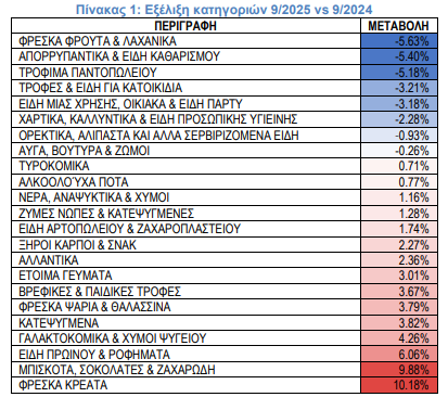 Μεγαλύτερες μειώσεις τιμών τον Σεπτέμβριο 2025 σε σχέση με τον Σεπτέμβριο 2024 καταγράφονται στις κατηγορίες: